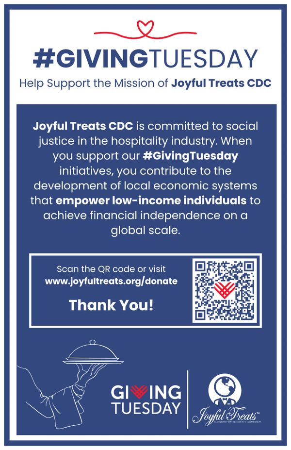 Joyful Treats CDC is committed to social justice in the hospitality industry. When you support our #GivingTuesday initiatives, you contribute to the development of local economic systems that empower low-income individuals to achieve financial independence on a global scale.